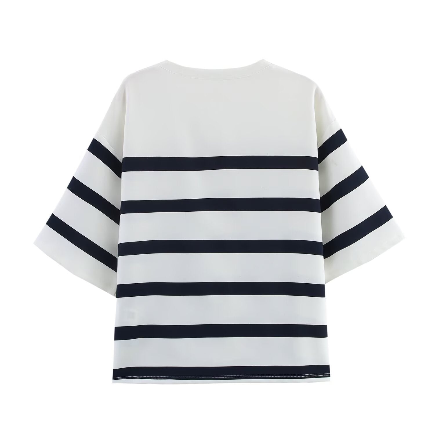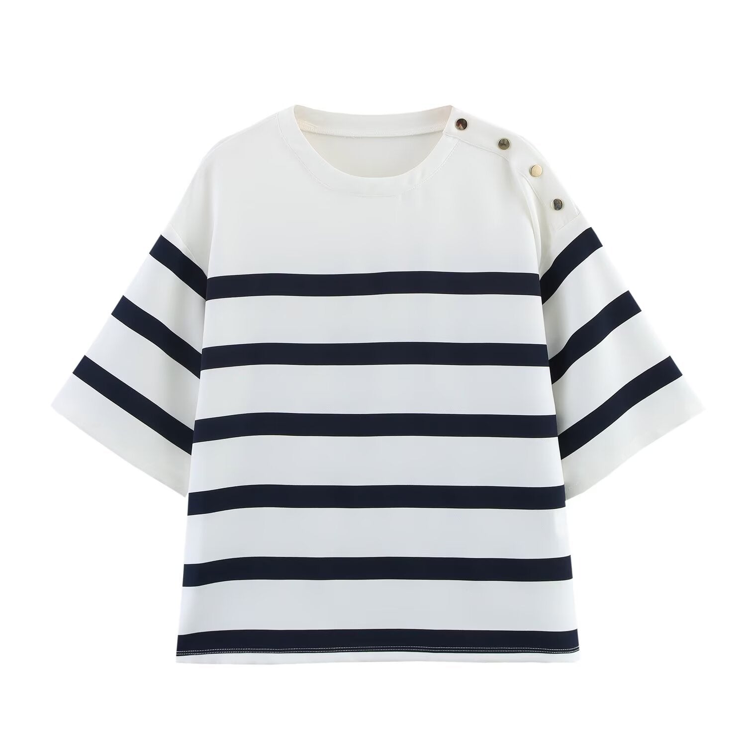 set woman 2 pieces2025 Fashion Striped short-sleeved Tops Vintage Female + high waist shorts Women's suit