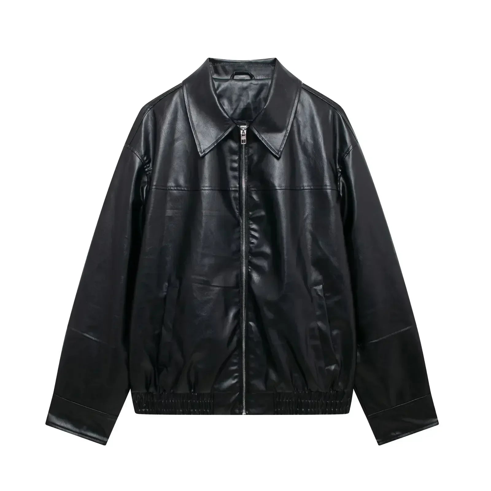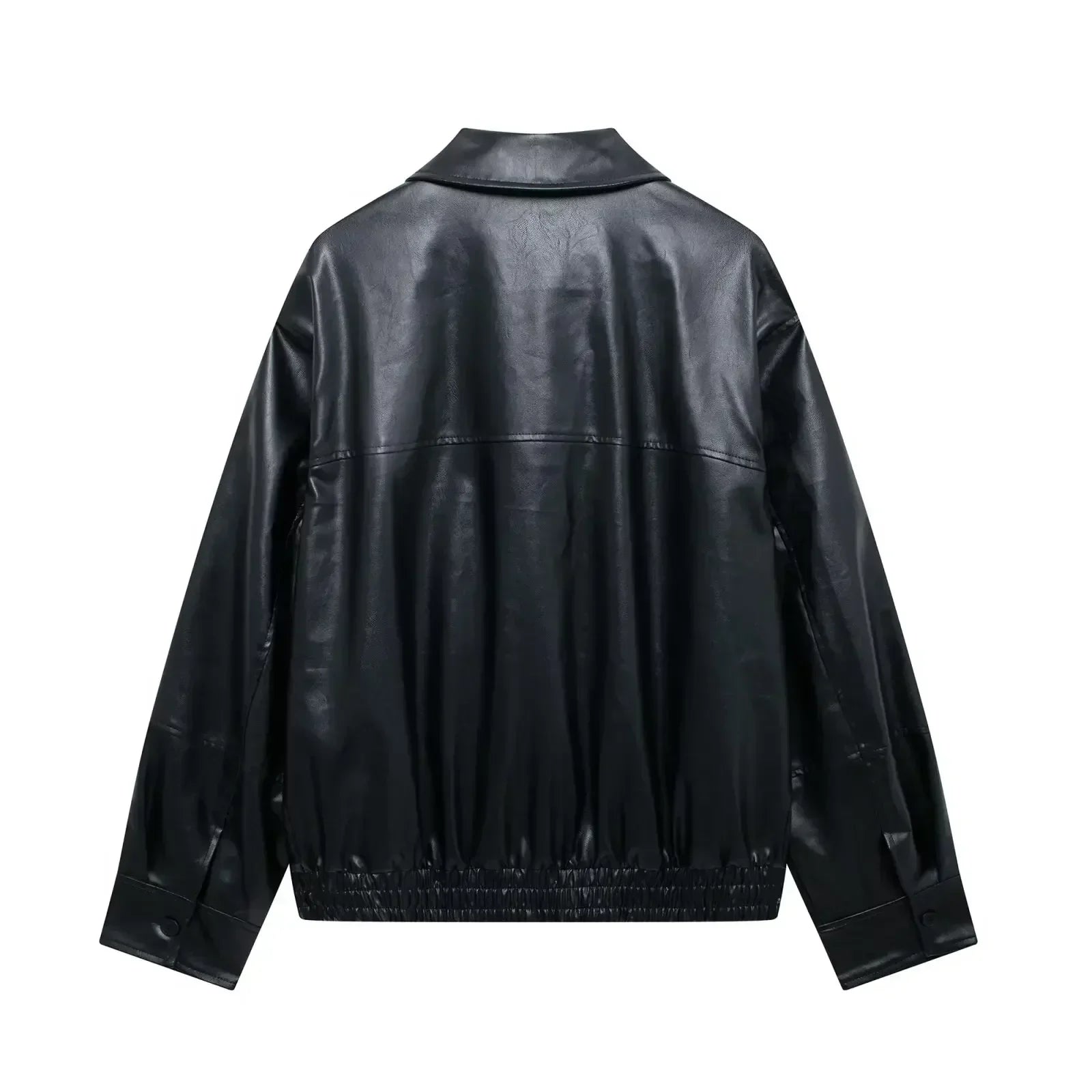Women's 2024 New Fashion Casual Side Pocket Solid Lapel Faux Leather Jacket Coat Retro Long Sleeve Zipper Women's Coat Chic Top
