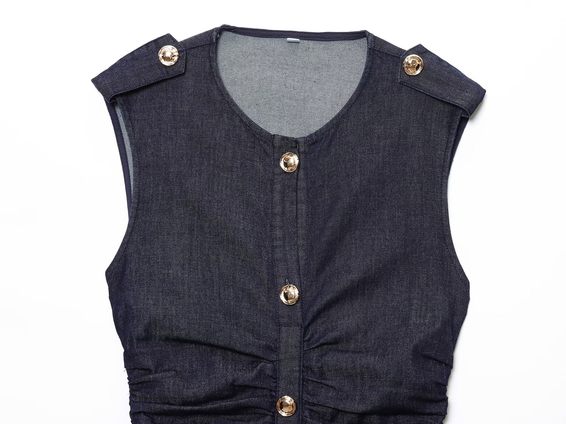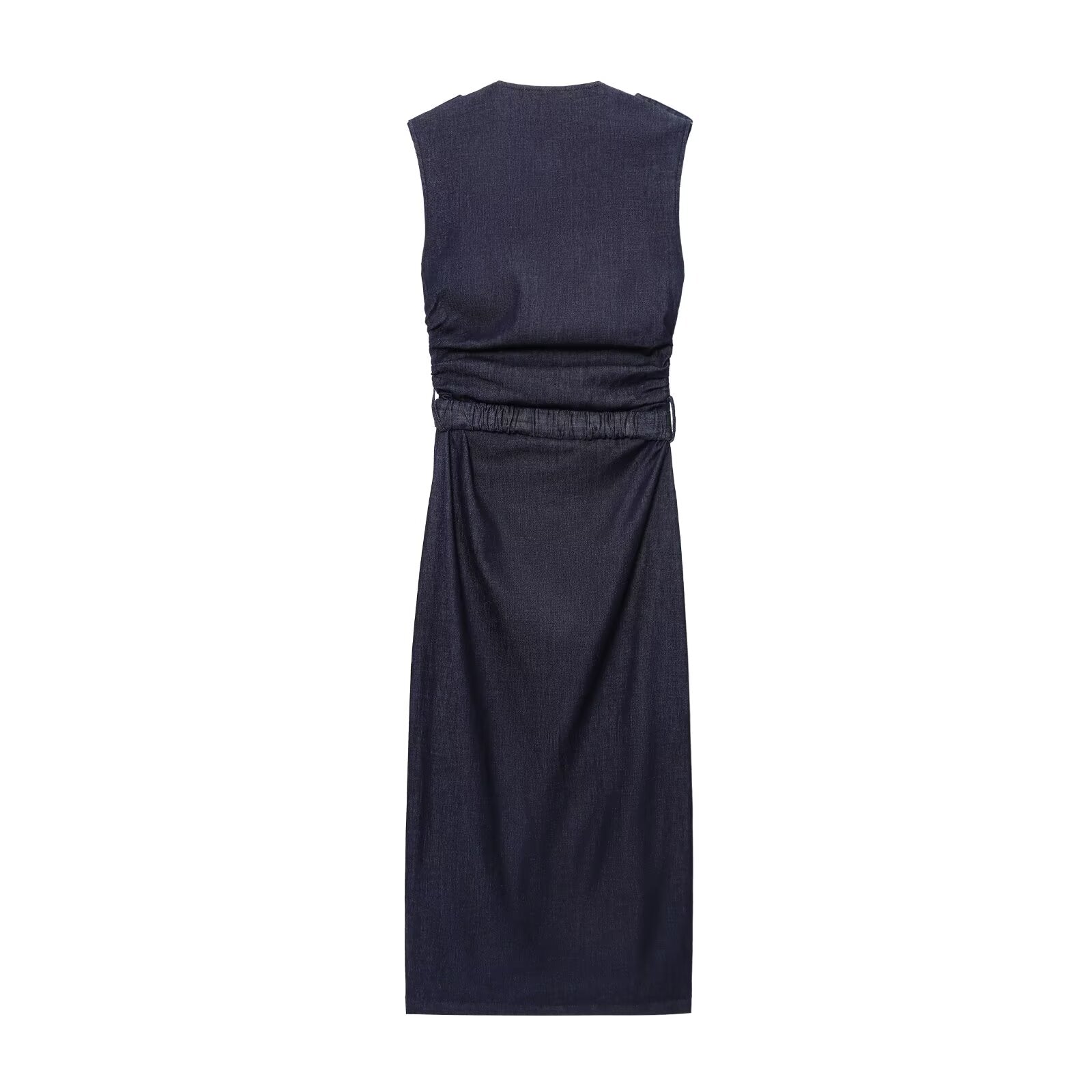 Women's 2025 new fashion with Belt slim pleated denim Midi dress