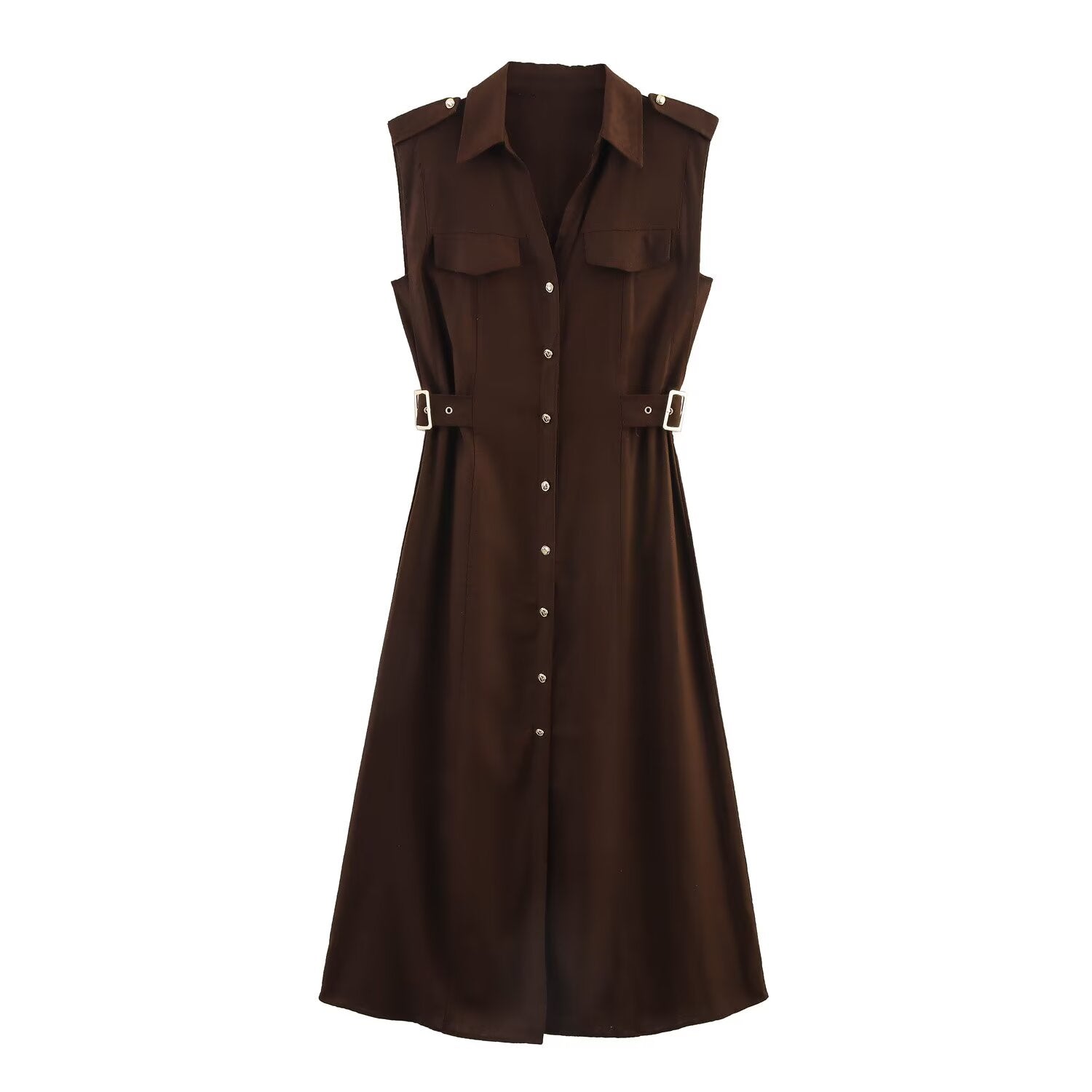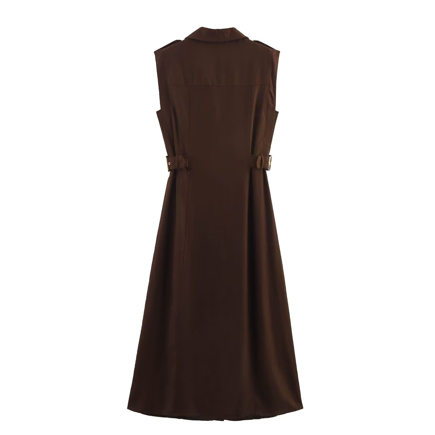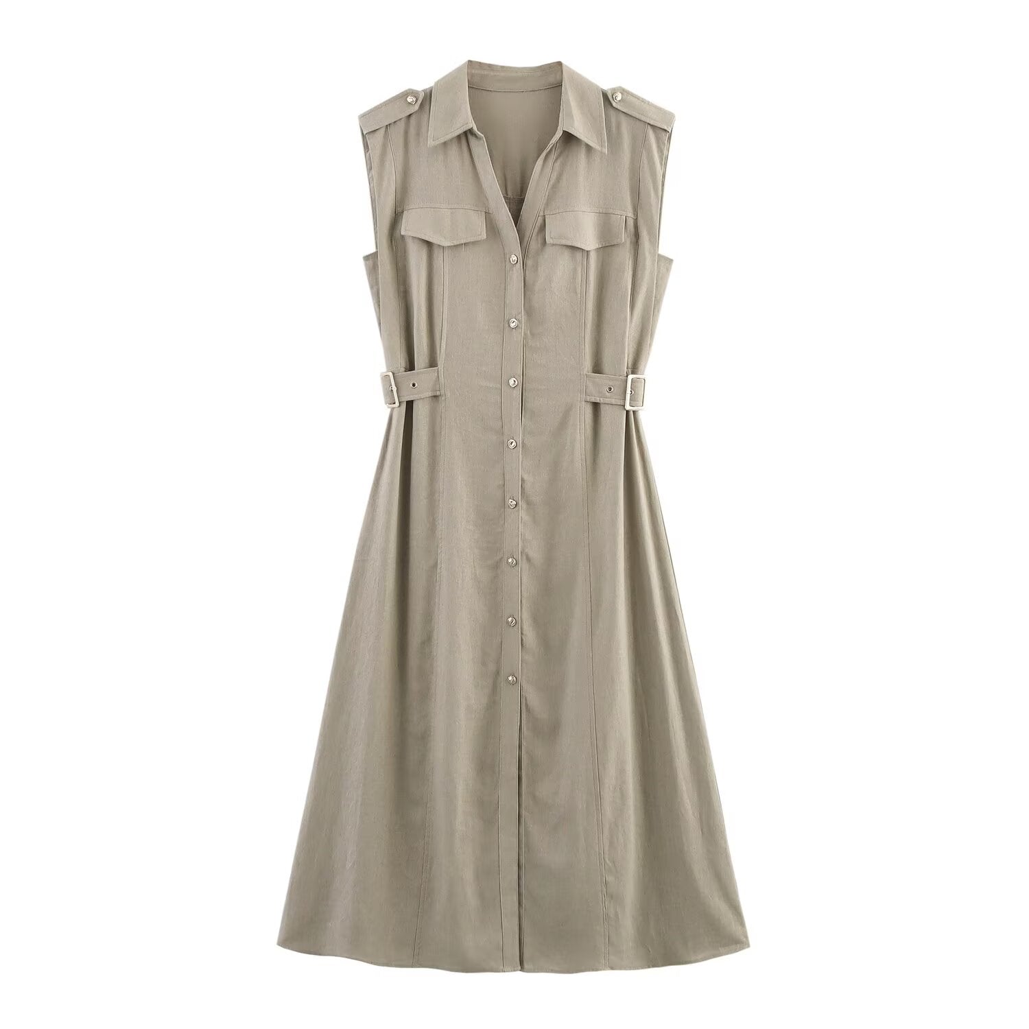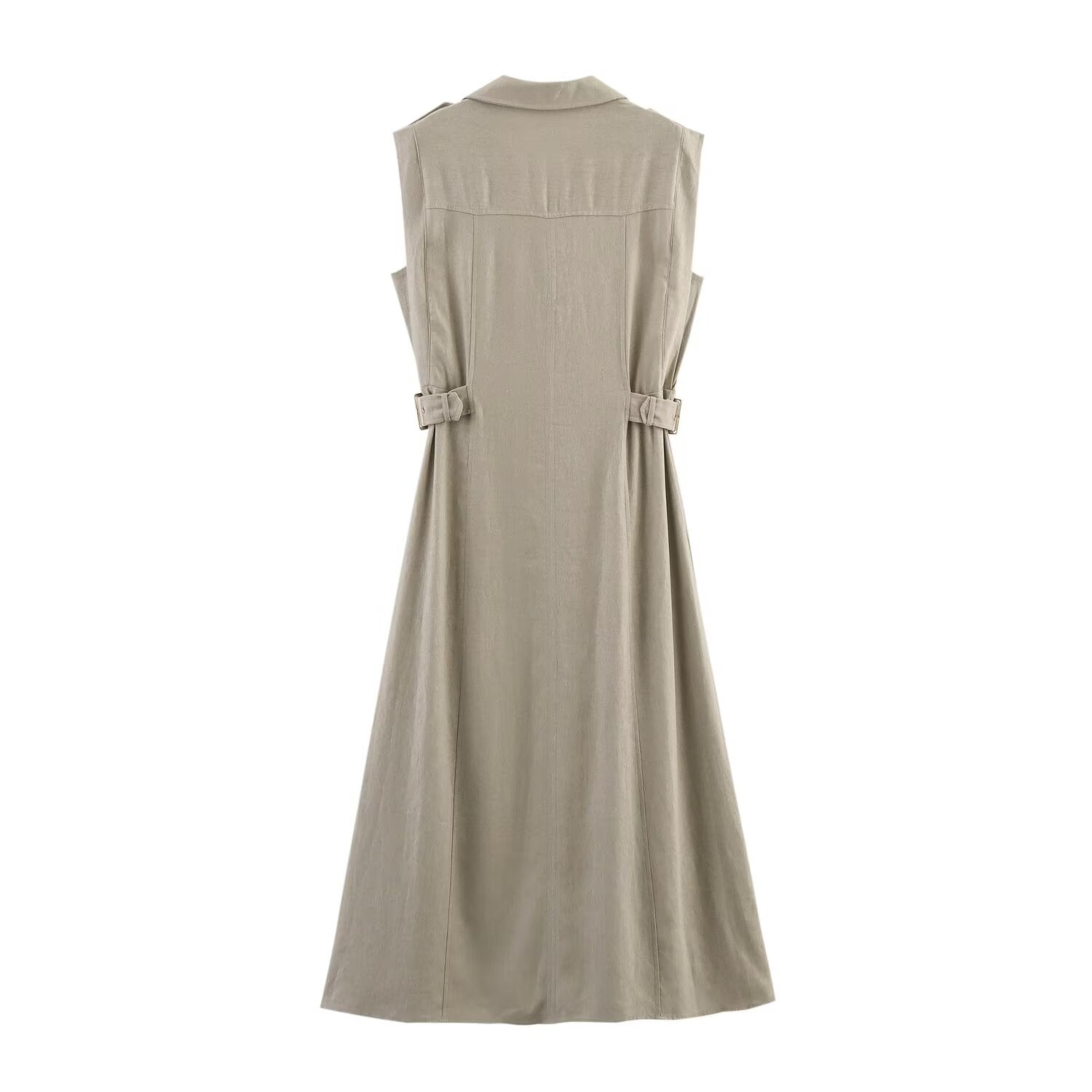 Women's new chic fashion flip decoration casual single breasted linen blended MIDI dress retro sleeveless women's dress