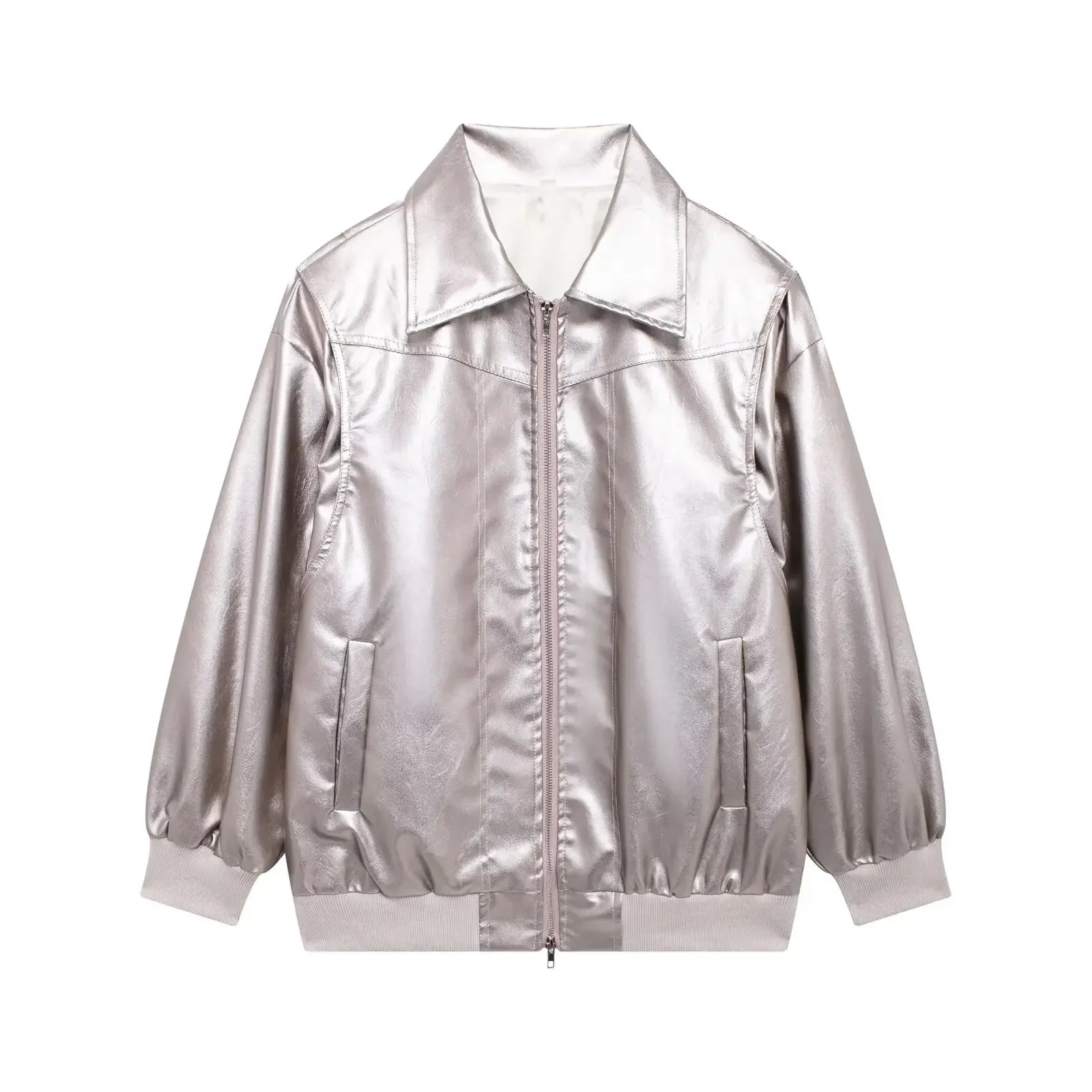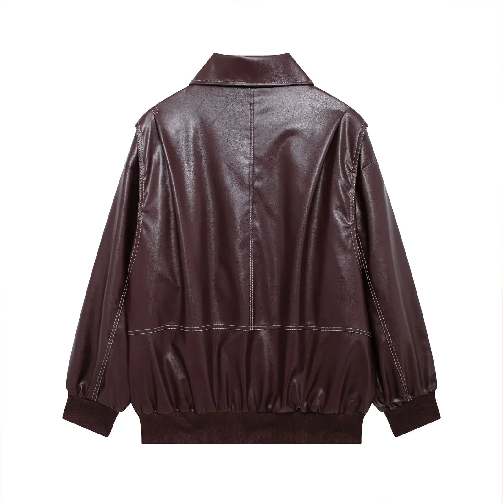 Women's new Fashion loose side pocket casual imitation leather jacket coat retro lapel long sleeved women's coat chic top