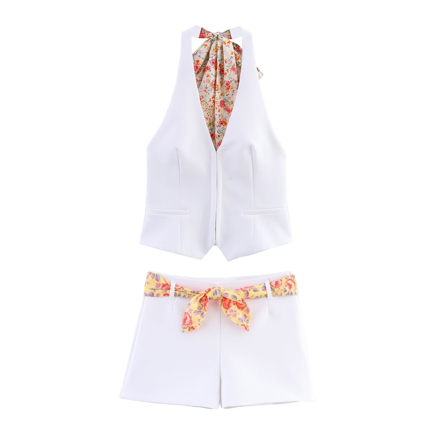 Women's new fashion printed halter neck vest retro sleeveless backless women's vest+Shorts Women's suit