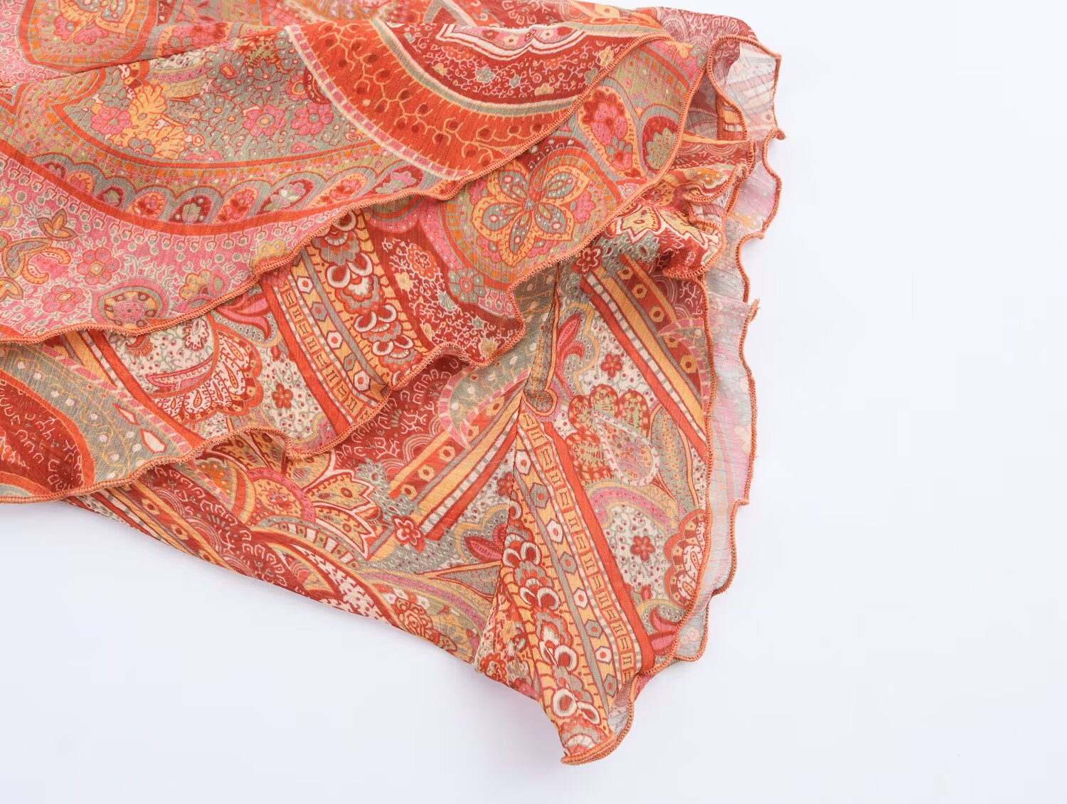 Women's new fashion printed trumpet sleeves ruffle edge top