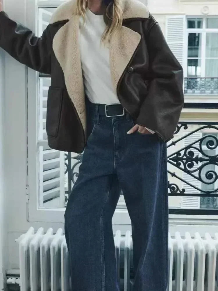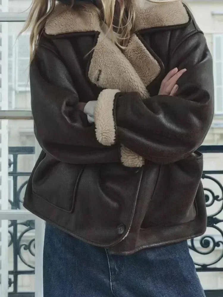 Women's winter new fashion loose single breasted double-sided Fur Faux Leather jacket retro long sleeved women's Coat chic top